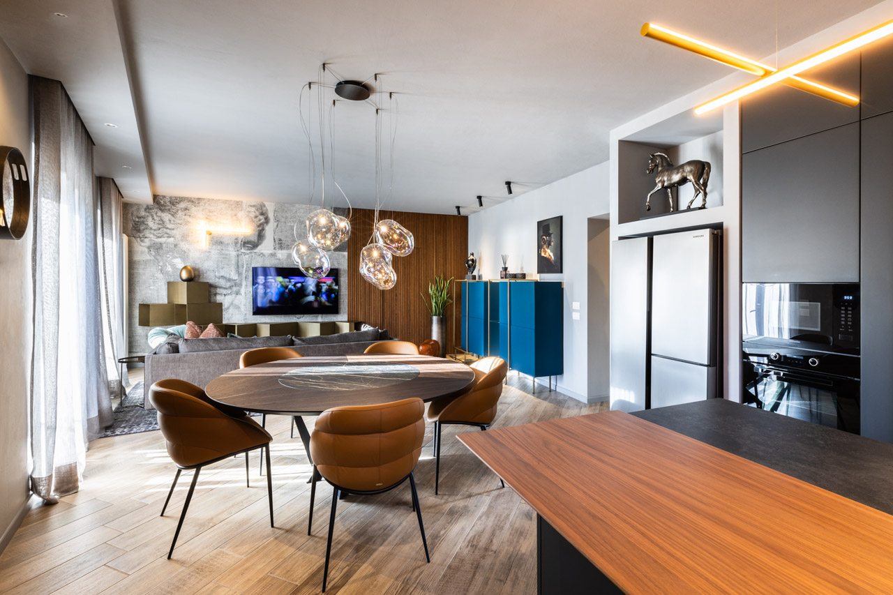 La scelta dei pavimenti, che spazia da tonalità calde del legno a finiture più moderne e sofisticate, contribuisce a creare un'atmosfera accogliente e contemporanea.