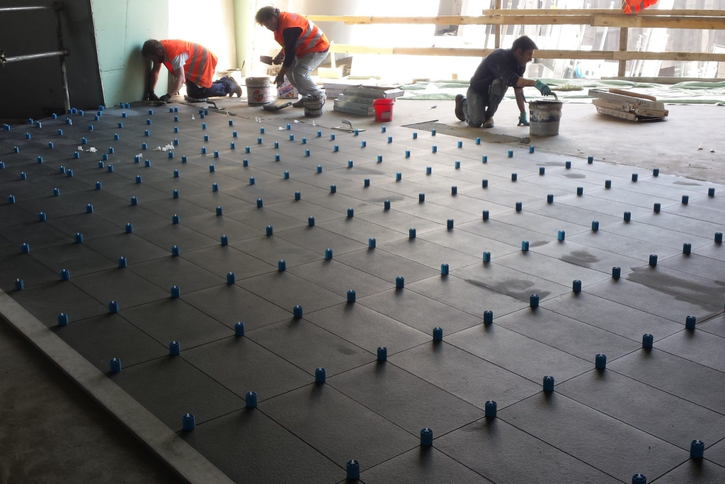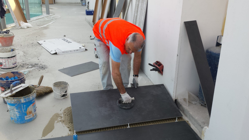 Per questo motivo, all'interno dell'edificio, per tutte le pavimentazioni è stata adottata la tecnica della posa incollata. Questa soluzione, scelta per gli ambienti interni, assicura infatti una perfetta aderenza delle superfici al sottofondo, riducendo al minimo il rischio di movimenti e migliorando la stabilità e la resistenza del pavimento nel tempo.